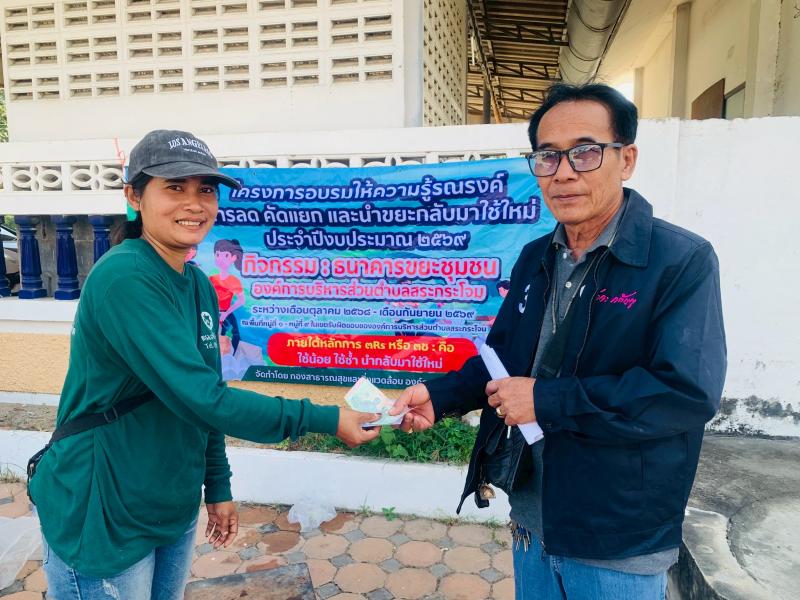 description โครงการอบรมให้ความรู้รณรงค์การลด คัดแยก และนำขยะกลับมาใช้ใหม่ ประจำปีงบประมาณ 2569 กิจกรรม : ธนาคารขยะชุมชน องค์การบริหารส่วนตำบลสระกระโจม ณ ศาลาประชาคม หมู่ที่ 3 person กองสาธารณสุข