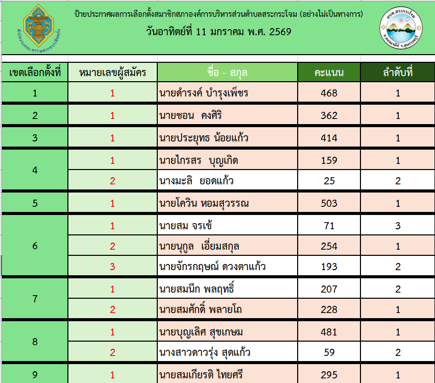 แบบบันทึกผลคะแนนเลือกตั้งนายกองค์การบริหารส่วนตำบลสระกระโจม และ สมาชิกสภาองค์การบริหารส่วนตำบลสระกระโจม (อย่างไม่เป็นทางการ) เลือกตั้งวันอาทิตย์ที่ 11 มกราคม 2569